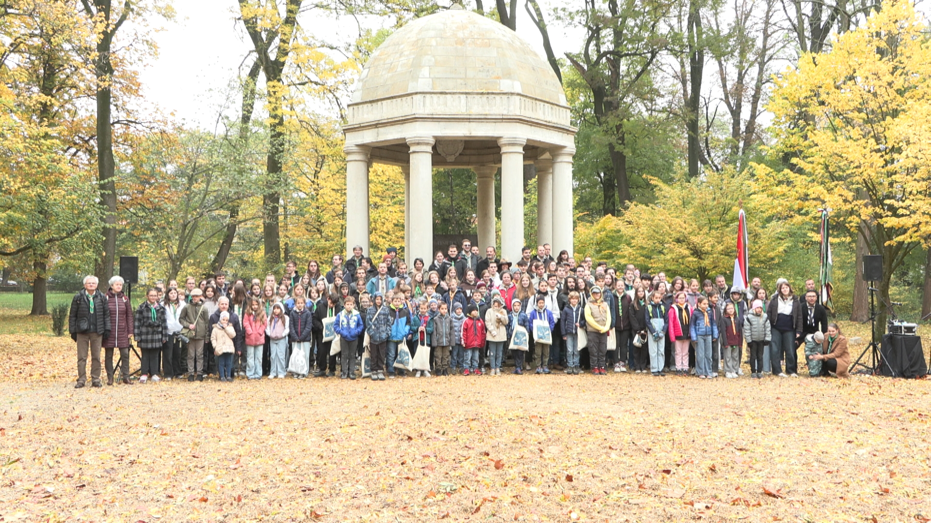 Elmaradhatatlan volt a közös éneklés is, a cserkész indulótól zengett a Helikon emlékmű előtti tér. Nagy Tamás, a Cserkészliliom Egyesület elnöke megosztotta a jelenlévőkkel az első, Herceg Festetics Györgyné zászlóanya által adományozott csapatzászló történetét, amelyet felmenői rejtettek el a tiltott időszakban. A centenáriumra új zászlót készíttettek, amelyet Solymos András atya áldott meg. Új zászlóanyát is választottak, Bangó Lászlónét kérték fel a posztra, aki esküt is tett a helyszínen. Ezt a tisztséget mindig olyannak adományozzák, aki tiszteletet érdemel, példaképként szolgál. A cserkészek elmondták, nem volt kérdés, hogy ez a személy Bangó Lászlóné legyen.