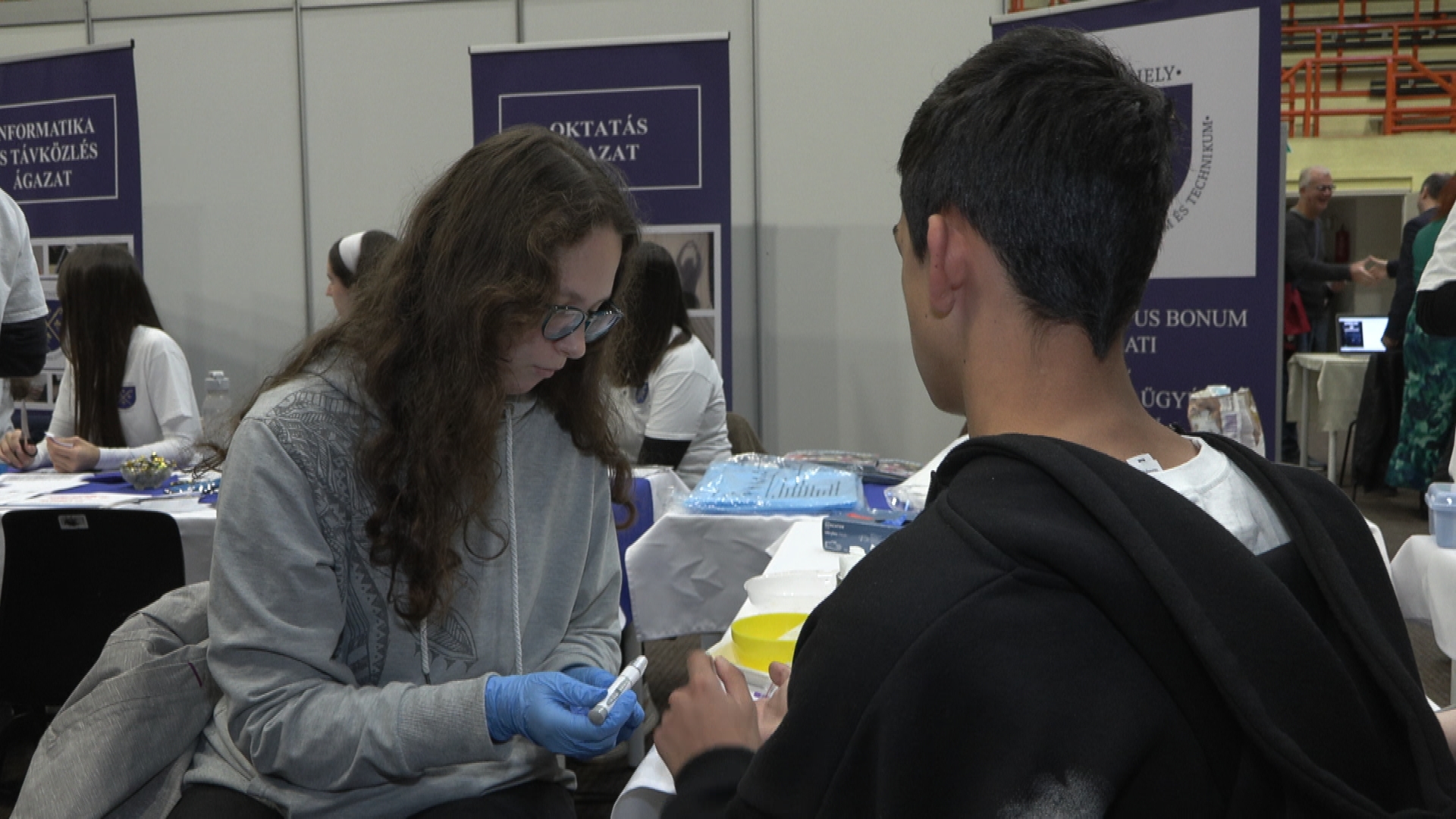 A Csokonai sportcsarnoka zsúfolásig megtelt a pályaválasztás előtt álló diákokkal. A Premontrei Szakgimnázium és Technikum egészségügyi standjánál vérnyomást és vércukorszintet is mérhettek a szakma iránt érdeklődők. Parragi Alíz nagy izgalommal próbálta ki a lehetőséget.