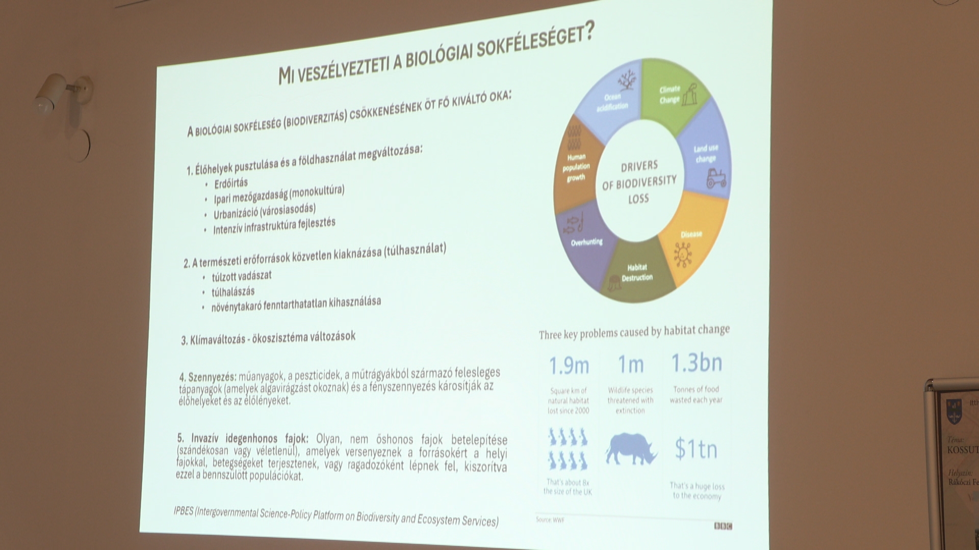 Némethy Sándor az előadásában rámutatott: a biológiai sokféleség az emberi túlélés alapja, mivel a természeti erőforrások jelentős része élőlényektől és ökoszisztémáktól származik. Utóbbi az élettelen természet és az abban élő élőlények közösségének kölcsönhatása. Az ökoszisztéma szolgáltatásai biztosítják az emberiség jólétét. A biológiai sokféleség arról szól, hogy harmóniában éljünk a környezetünkkel, figyelembe véve annak eltartó képességét.