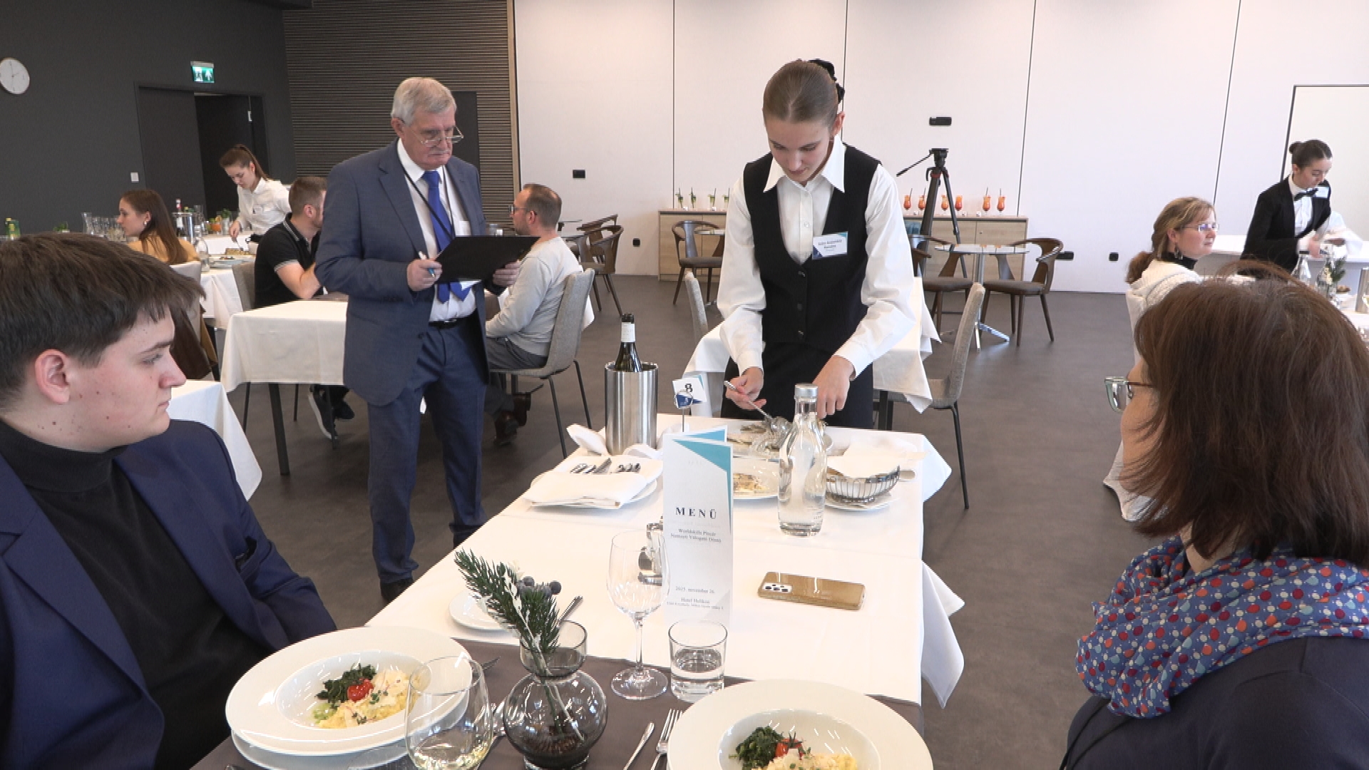 Tizenhárom órára készen állt minden a vendégfogadásra. Sorban érkeztek a meghívottak az ebédre. Feladat volt a vendégek fogadása és ültetése is. A versenyzők az előétellel kezdték a szervírozást, ami marinált kecskesajt volt levendulával és pisztáciával. Azt követően az épített jalapeno krémlevest kóstolták a vendégek. A borszervizt a főétel előtt végezték el a pincérek. Mind a nyolc versenyzőnél érezhető volt, hogy a szakmai elvárások mellett figyelnek higiéniára, a megjelenésre és a jó időbeosztásra."Sok időnk nem volt a felkészülésre, egy-két hetünk volt rá, de viszont ebben megpróbáltuk a maximálisat kihozni. Reméljük, hogy ez összejött. Koktélokat kevertünk, szalvétákat hajtogattunk, felszolgálást gyakoroltuk. Most szerintem a legnehezebb, amitől mindenki félhet, az a halfilézés lesz. De reméljük ezzel sem lesz gond és mindenki felkészült rendben." nyilatkozott Pétervári Bence.