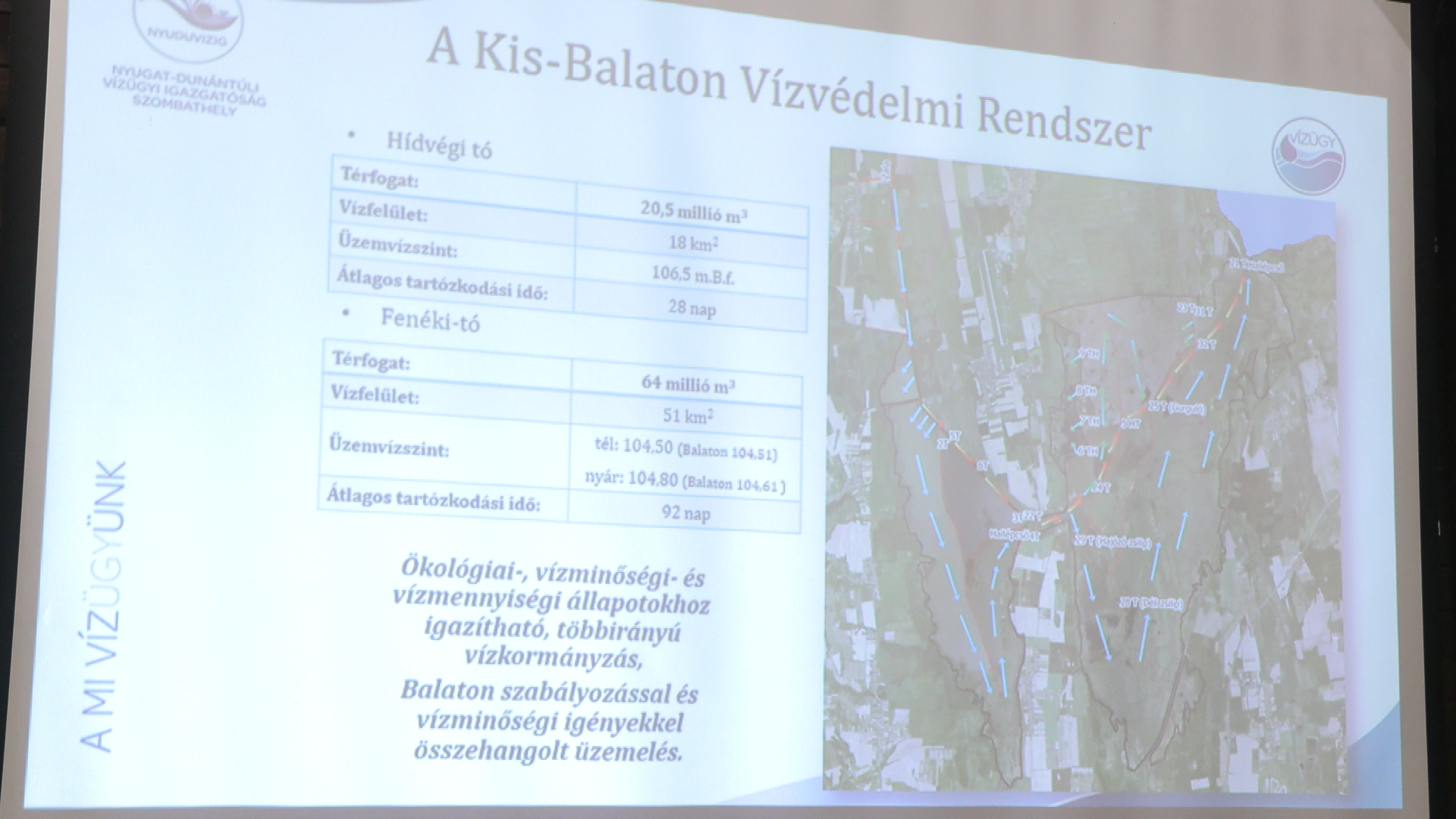 Egy tájékoztató előadás keretében egy olyan kutatás eredményét ismertették a környékbeli polgármesterekkel, ami a Vízvédelmi Rendszer üzemeltetési és karbantartási stratégiájának tervét tartalmazza. A „Víztudományi és Vízbiztonság Laboratórium” címet viselő főprojekt alprojektjének keretében kutatóintézetekkel és tudományos körökkel együttműködve végeztek feltárásokat, elemezték a negyven éves adatsorokat és talajtani térképeket hoztak létre. Busa Tamás, a Nyugat-dunántúli Vízügyi Igazgatóság műszaki igazgató-helyettese elmondta: "Nagyon sok tématerületet felölelt a vízzel kapcsolatban: folyóvizek, állóvizek, vizes élőhelyek, vízminőségi kérdések, a vízkörforgással kapcsolatos, a vízkörforgás elemeivel kapcsolatos kutatási elemeket. Nagy kutatóintézetek, Pannon Egyetem, Műszaki Egyetem, Budapesti Műszaki Egyetem benne volt."