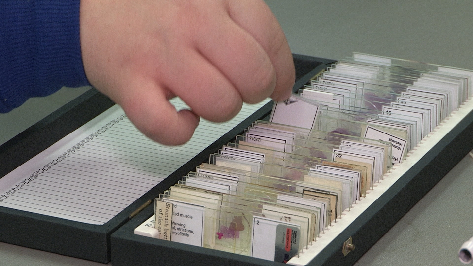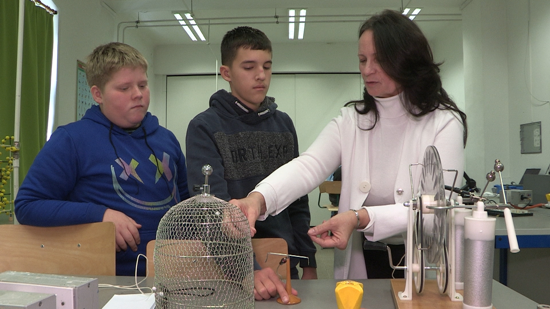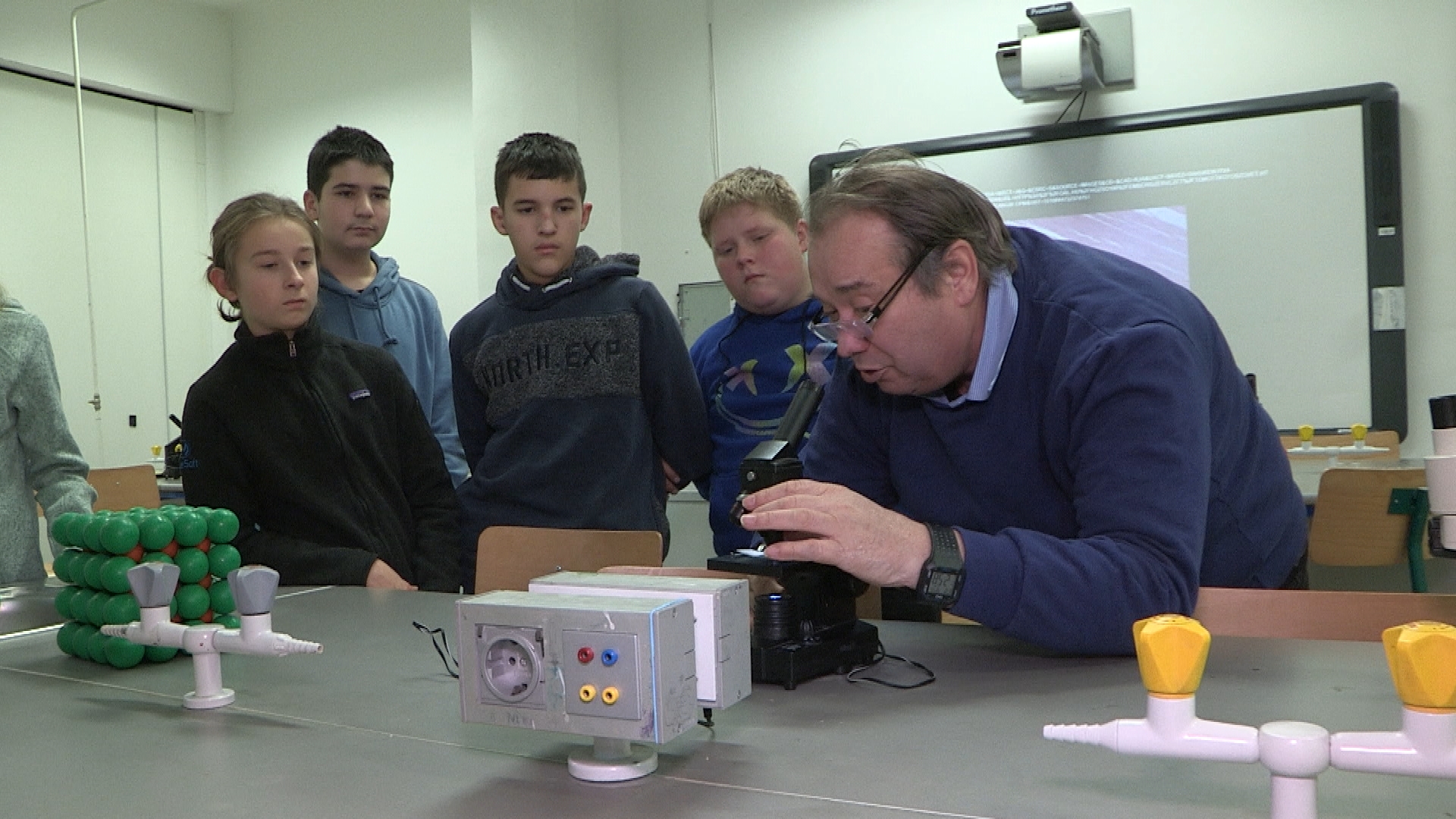 Az új mikroszkóp helyes használatát magyarázza a Vajda János Gimnázium biológiatanára a természettudományi szakkörön. A megújult laborban látványos kísérletet végeznek a tanulók. Nagy az érdeklődés az ismeretanyag magas szinten való elsajátítására. Piszker Máté a hat osztályos gimnáziumba jár. Céltudatosan készül a továbbtanulásra."Én Sármellékről jöttem ide a Vajdába. Igazából a biológia engem azért érdekel, mert és szívesen lennék orvos és itt a mai nap tanár úr segítségével állati szöveteket tanulmányozunk mikroszkópokkal."- nyilatkozott Piszker Máté.