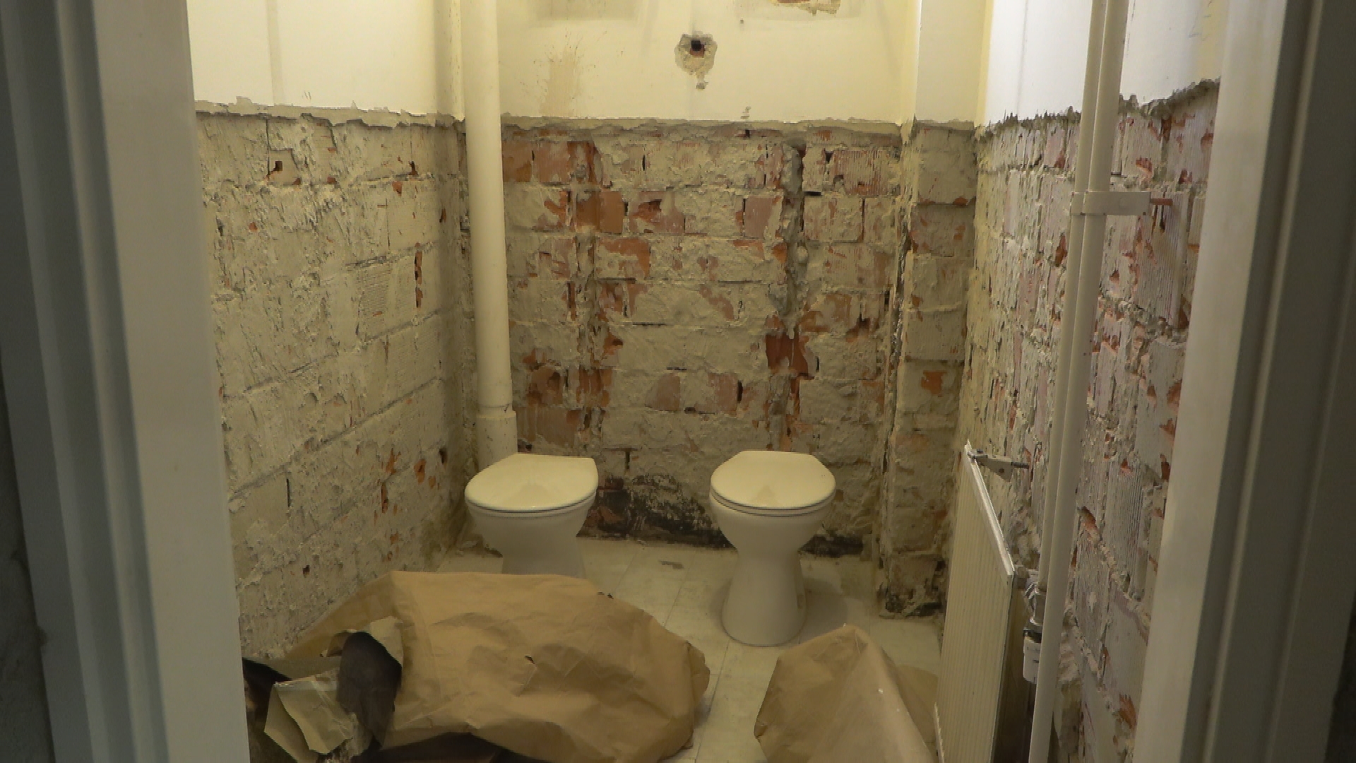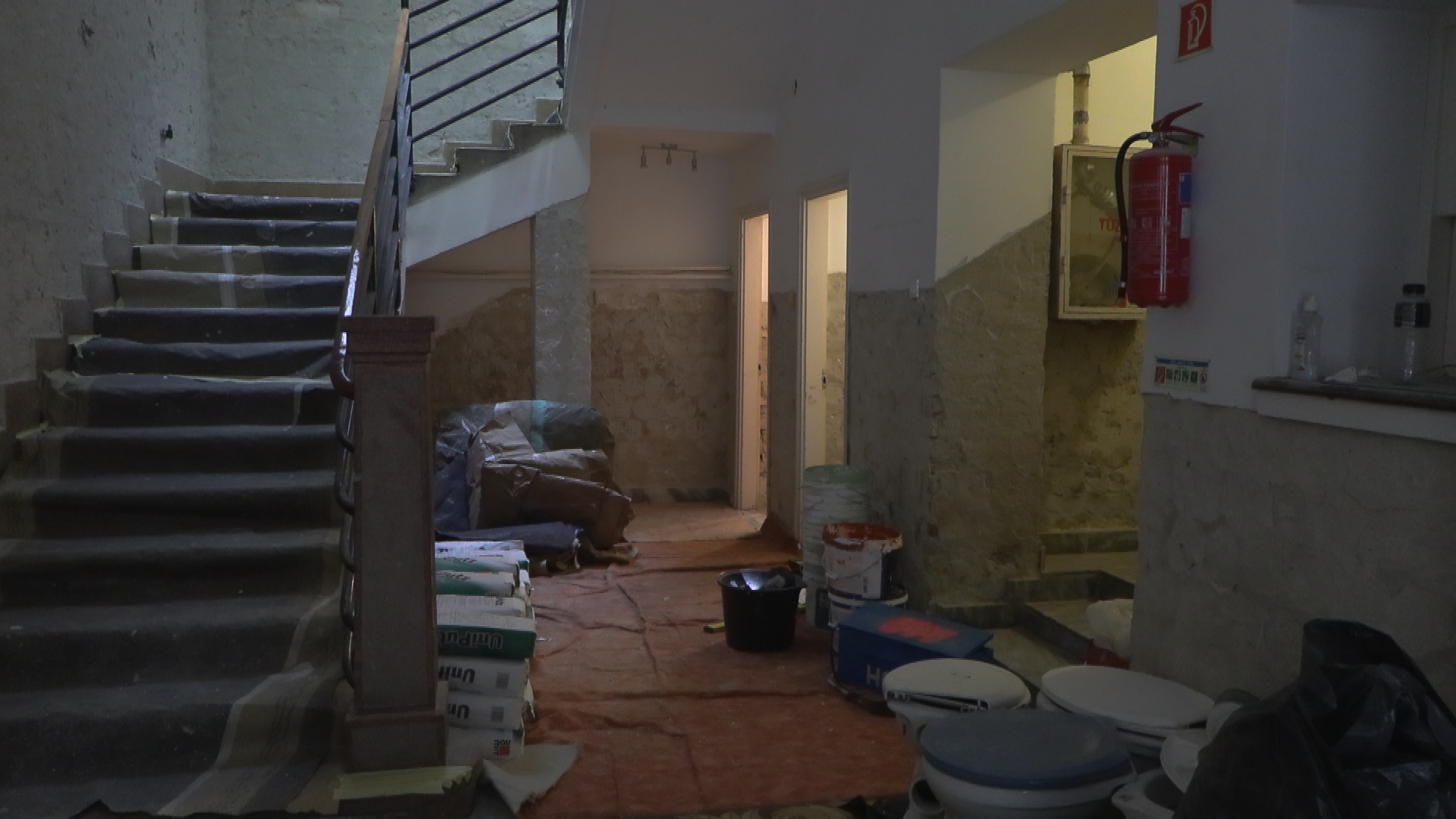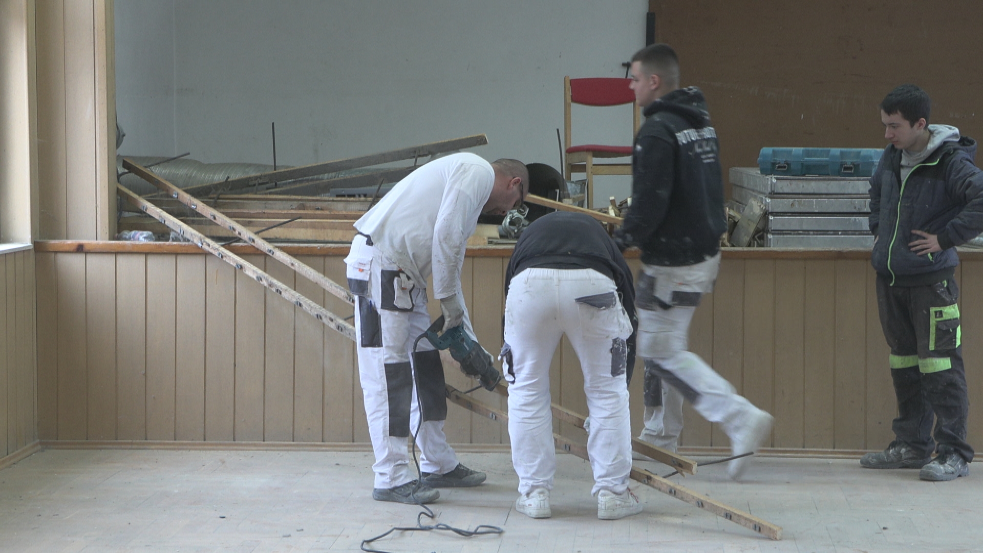 Bontási munkálatok a HEMO nagytermében. A kivitelező jelenleg az álmennyezet elemeit távolítja el és darabolja. Az utóbbi évtizedekben markáns felújítás nem volt itt. A nagyteremben felcsiszolják a parkettát, teljesen felújítják a villamos- és gépész hálózatot, új lámpákat szerelnek fel. Az oldalfal burkolata megmarad, ezeket lefestik. A nagyterem mellett a központi lépcsőházat, illetve a földszinti és emeleti vizesblokkokat újítják fel. Mindenhol javítják és festik a falakat.