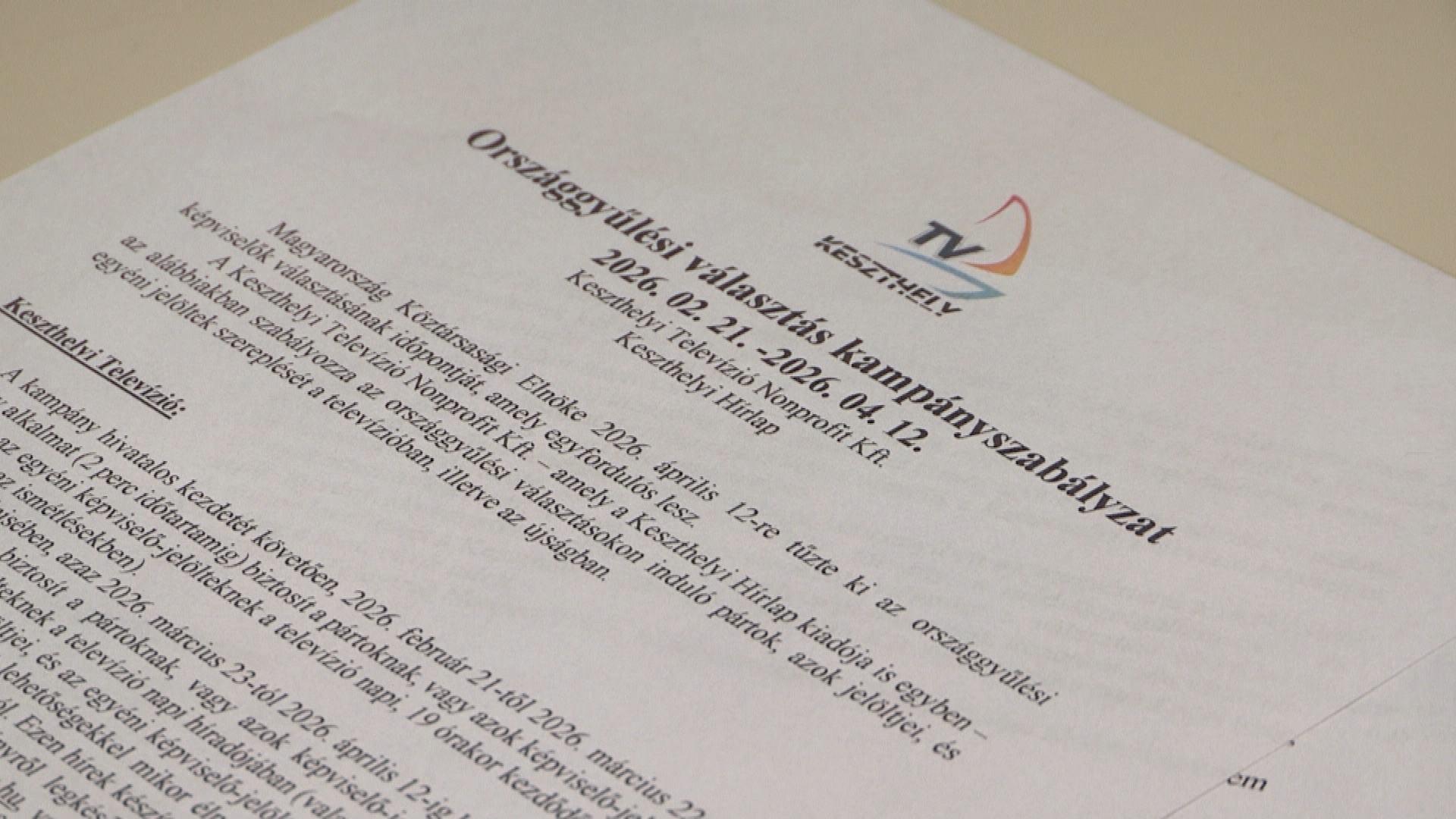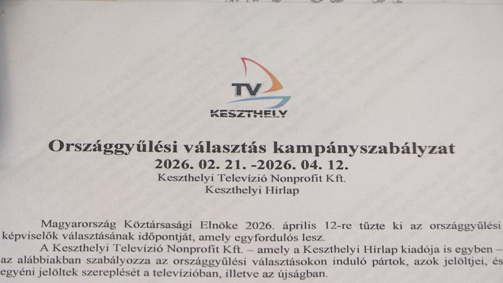 Szerkesztőségünk ebben a dokumentumban határozta meg, hogy a jelölteknek és jelölő szervezeteknek milyen megjelenési, bemutatkozási lehetőségeik vannak február 21. és április 10. között a Keszthelyi Televízióban és a Keszthelyi Hírlapban. Médiumunk az ismert indulóknak elküldte a szabályzatot, melyben foglaltak csak abban az esetben érvényesek, amennyiben azt az érintett pártok, szervezetek képviseletre jogosult vezetői, vagy a független jelöltek aláírásukkal ellátják. A kampányszabályzat INNEN.