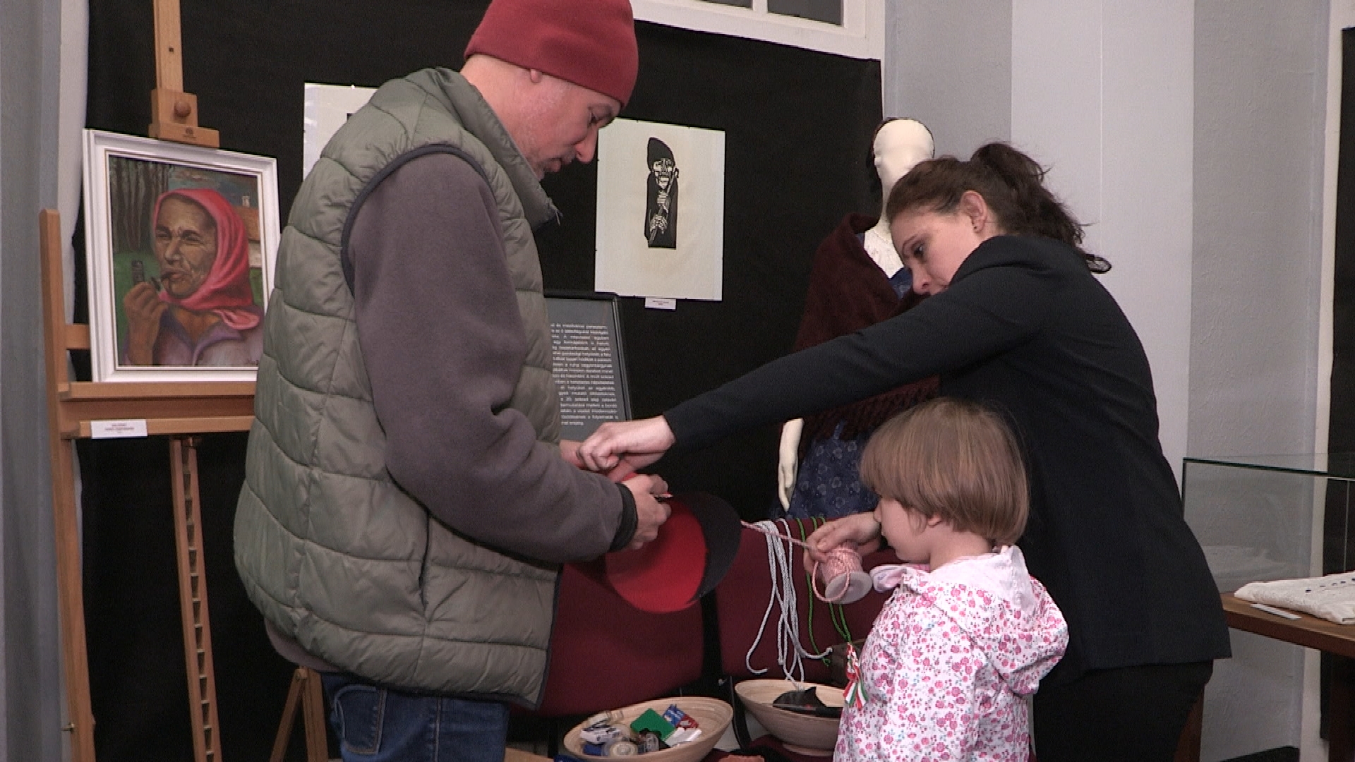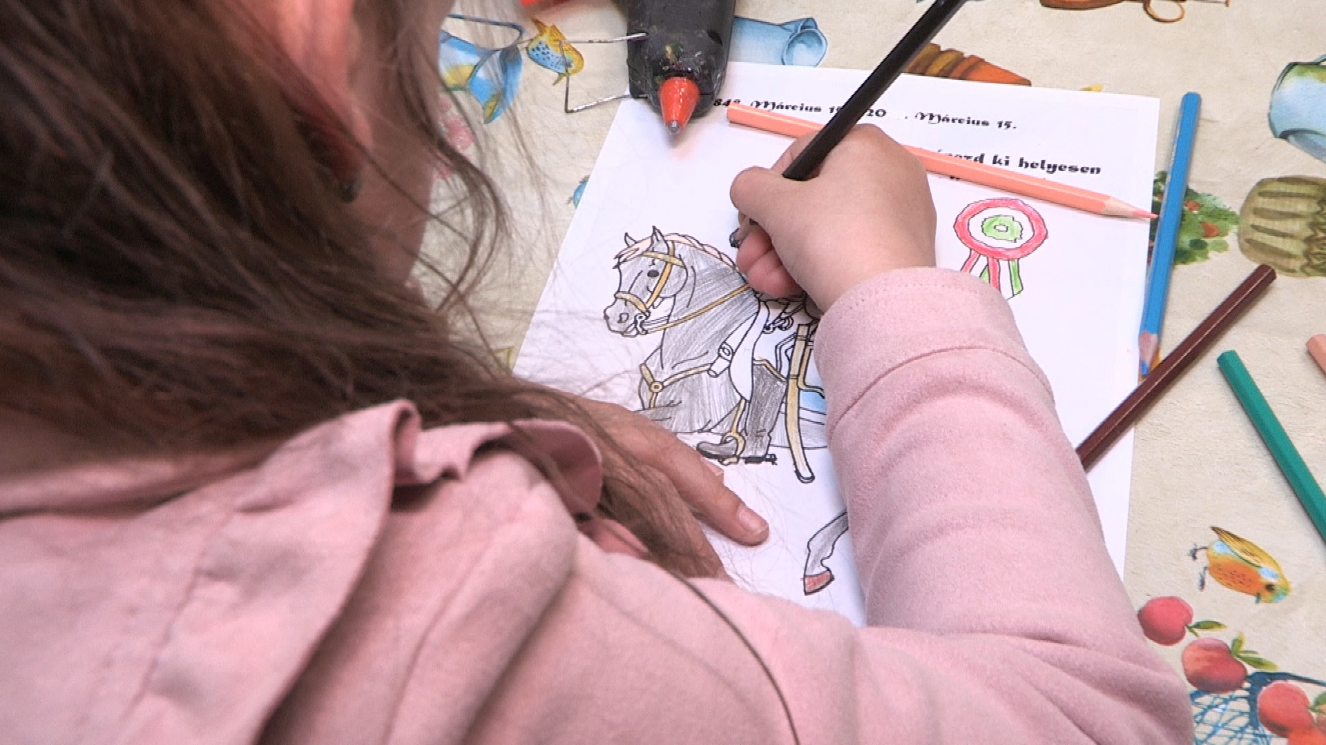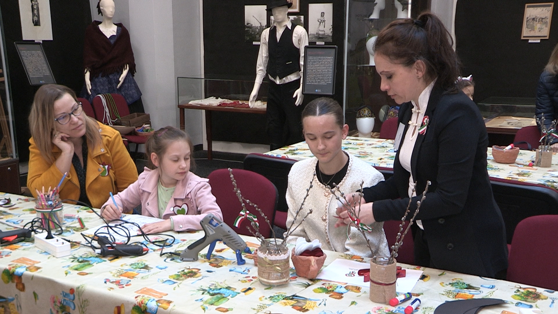 Folyamatosan készültek a csákók, kokárdák és a színes rajzok a látványtárban. A felnőttek ugyanolyan lelkesedéssel ültek le az asztalok mellé kézműveskedni, mint a gyermekek. Saját elképzelések alapján, a színek és a formák kiválasztását követően valósultak meg a forradalmi fejfedők. A trikolor jelképeket is különböző technikával lehetett elkészíteni. Ki stiftes ragasztóval, más ragasztópisztollyal dolgozott. Mindenki élvezte az alkotást. Fischli Léna Karolina huszáros képet is színezett.