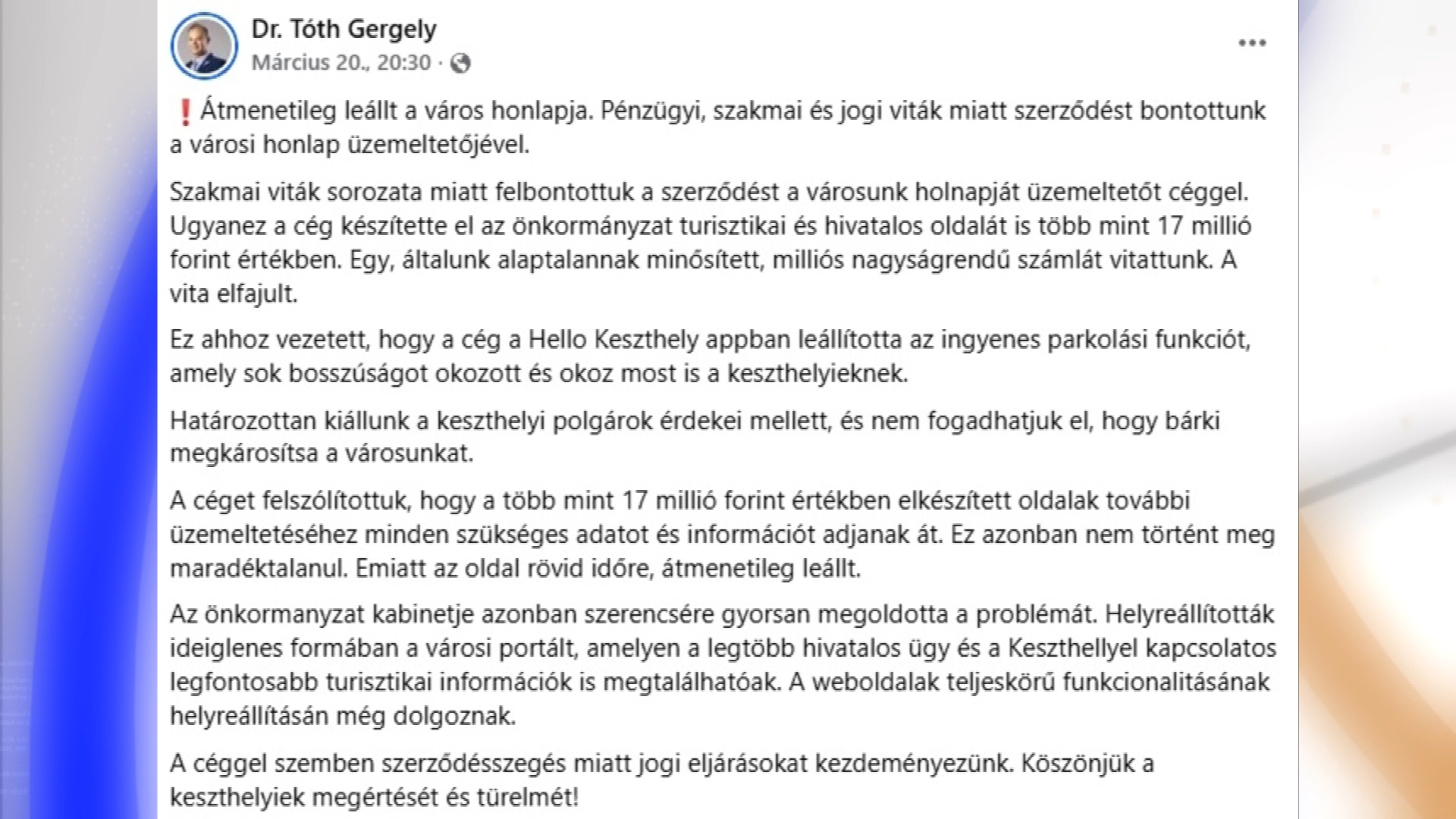 Keszthely polgármestere március 20-án azt írta közösségi oldalán, hogy pénzügyi, jogi és szakmai viták miatt szerződést bontottak a városi honlap üzemeltetőjével. A céggel szemben szerződésszegés miatt jogi eljárásokat kezdeményeztek.