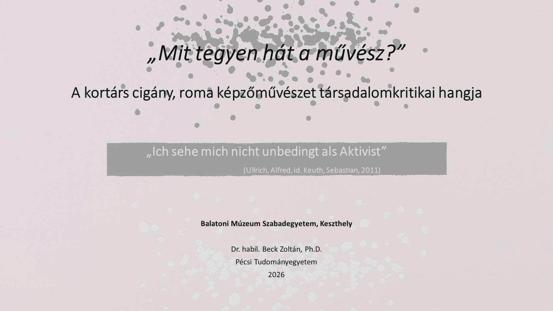 Beck Zoltán a kortárs roma képzőművészet társadalomkritikai szerepét vizsgálta, különös tekintettel arra, hogy a művészet miként tud megszólalni a társadalmi térben és hogyan formálhatja az identitásról, értékekről alkotott gondolkodásunkat.