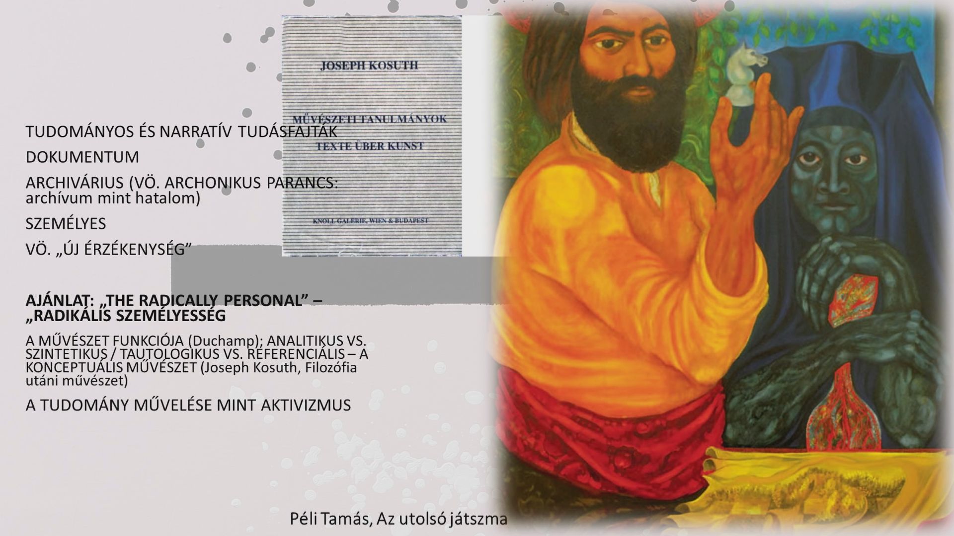 Az előadás a jelenből indult ki és azt vizsgálta, milyen szerepet tölthet be a művészet a társadalmi térben. Az előadó Péli Tamás monumentális pannóját úgy mutatta be példaként, amely nemcsak a roma identitás képi megfogalmazása, hanem egy közösségi alkotási folyamat eredménye is. A művész a tiszadobi gyermekvárosban, a fiatalokkal együttműködve hozta létre az alkotását, így maga a folyamat is a mű részévé vált. "Ez azt jelenti, hogy nem oda szállítódik egy kép, hanem Péli Tamás festőművész beköltözik ebbe a térbe és a gyerekekkel beszélgetve, velük együtt töltve időt, a gyerekek szeme láttára készül az alkotás. Ez önmagában egyszerre interakciót is jelent, magyarul nem csak a kész műalkotás lesz műalkotás, hanem a műalkotás folyamata is belekerül" - tette hozzá.