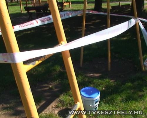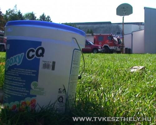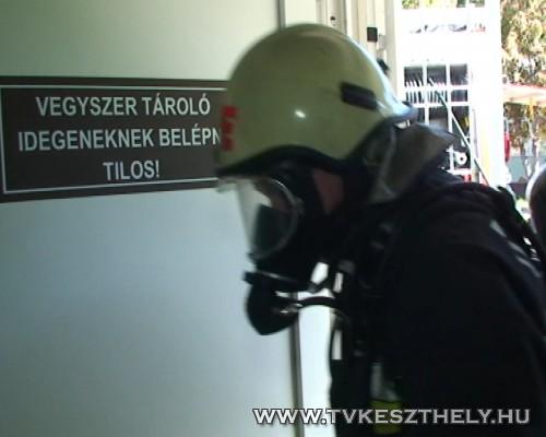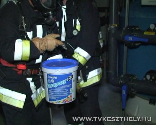 Érkeznek a keszthelyi tűzoltók a gyakorlatra. A feltételezés szerint az uszoda gépházában sósavat öntöttek össze hipóval, ami miatt veszélyes klórgáz képződött.