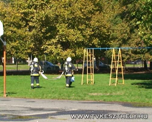 Iskola lévén a gyakorlat a gyerekek számára is látványosság volt, így a szünetben ők is érdeklődve nézték az eddig csak tévében látott, most testközelből élvezhető munkát. A tűzoltók a helyzetnek megfelelően védőfelszerelésbe öltöztek, gázálarcot vettek fel, majd behatoltak az épület alatt található gépházba.