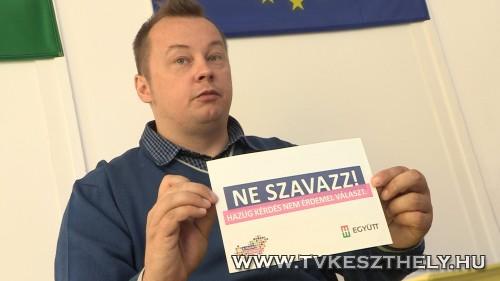 „Különösen felháborító számunkra, hogy szeptember 14-én a keszthelyi önkormányzat egy olyan határozatot hozott, melyben azon túl, hogy megtették a kötelező hűségnyilatkozatot a kormány politikája mellett még maximum 450 ezer forint értékig a városnak a reklmám és propaganda célokra elkülönített tartalékából megszavaztak egy összeget – úgymond – tájékoztató kampány céljaira. Tudjuk milyen ez a tájékoztató kampány valószínűleg hasonló tartalmú lesz ez is, mint amit országosan eddig láttunk. Ez egy csepp a tengerben, szerintünk nincs arra szükség, hogy a keszthelyiek pénzét erre költsék, ennek sokkal jobb helye lenne máshol, például városmarketingben.” - nyilatkozta az Együtt választókerületi elnöke.